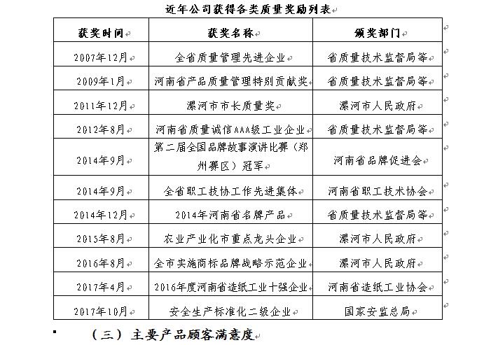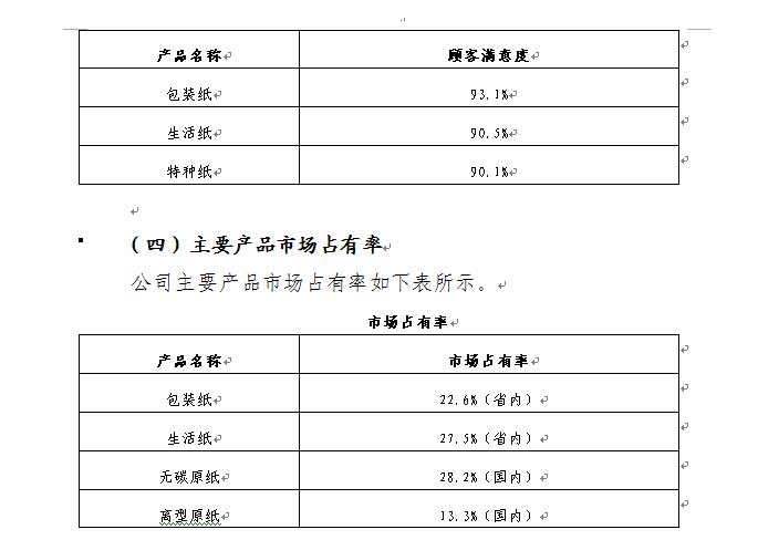 公司顧客滿意度目標(biāo)值為90%,其中主要產(chǎn)品(包裝紙、生活紙、特種紙)顧客滿意度均在90%以上。