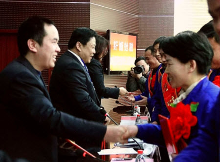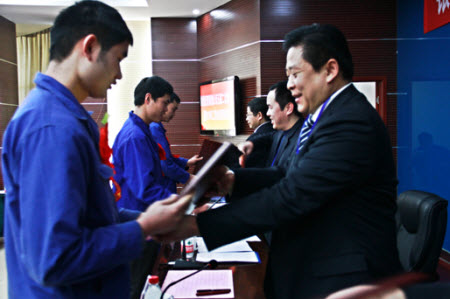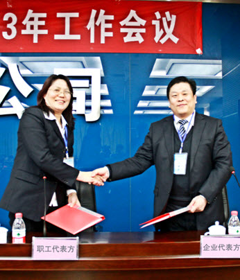 會(huì)議審議并通過了公司經(jīng)理層工作報(bào)告、工會(huì)工作報(bào)告、安全工作報(bào)告、員工獎(jiǎng)懲暫行規(guī)定,各下屬公司(基地)領(lǐng)導(dǎo)宣讀并向王董事長遞交2013年經(jīng)營目標(biāo)責(zé)任狀,表彰了2012年度先進(jìn)集體和先進(jìn)個(gè)人。陳應(yīng)樓主席代表工會(huì)方與企業(yè)方代表王偉董事長簽訂了集體合同。