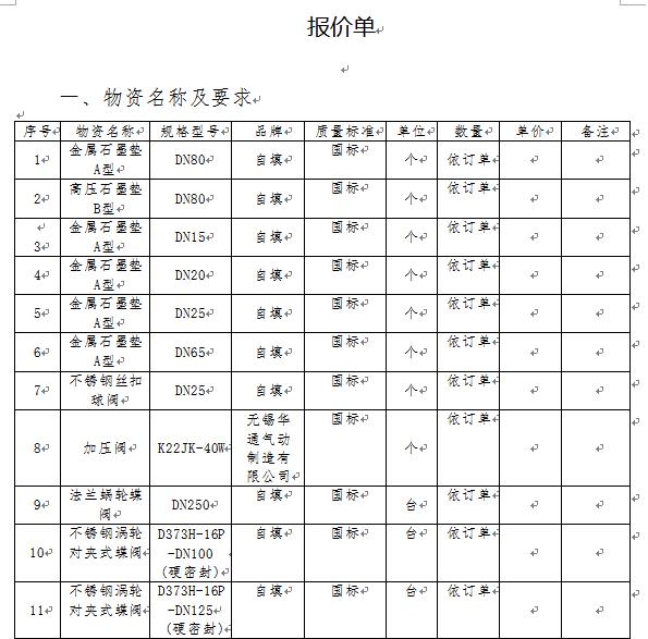 根據(jù)我公司生產(chǎn)需求,現(xiàn)需向你公司對以下物資進行公開詢價,具體要求如下: