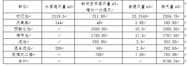 其中初沉池和厭氧塔水面通風(fēng)量按照單位面積3m3/(m2`h),混合泥池水面通風(fēng)量按照單位面積10m3/(m2`h)。其中預(yù)酸化池、調(diào)節(jié)池和泥池因為是水泥封閉池?zé)o外溢可能,故沒有考慮水面通風(fēng)量,其中封閉空間按照50%液位時的空間計算。板框機二樓封閉未按8次換氣量計算的主要原因在于,基地計劃尋找一種化工從源頭解決異味產(chǎn)生,另后期氧化溝更換推流曝氣時可以將風(fēng)機的進(jìn)風(fēng)口設(shè)置在這,故在該項目時板框機二樓只考慮1次通風(fēng)。