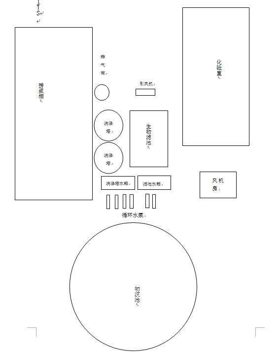 根據(jù)上表計算的換氣量,建議風(fēng)量不低于7000m³/h;進(jìn)行廢氣收集后,采用玻璃鋼管道輸送送入廢氣處理系統(tǒng),設(shè)置1套一級噴淋系統(tǒng)+1套二級噴淋系統(tǒng)+1套生物濾池除臭設(shè)備+管道輸送系統(tǒng)+15米高空排放系統(tǒng)+檢修平臺;位置坐落在撈漿棚和供水化驗室之間,設(shè)備坐落情況見示意圖。