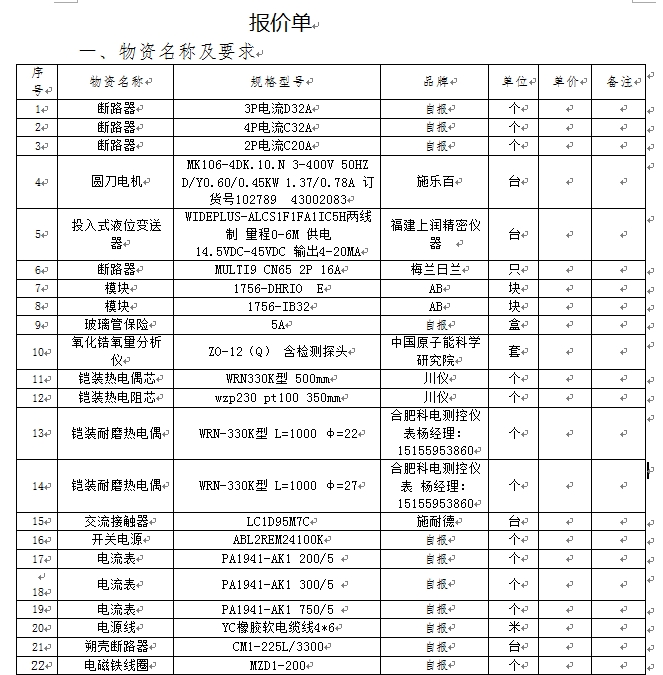 根據(jù)我公司生產(chǎn)需求,現(xiàn)需對以下物資進行公開詢價,具體要求如下: