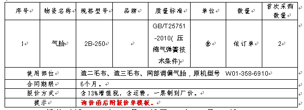 根據(jù)我公司生產(chǎn)需求,現(xiàn)需對(duì)以下物資進(jìn)行公開詢價(jià),具體要求如下:
