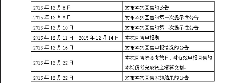 6、回售部分債券兌付日:2015年12月22日。本公司委托中國(guó)證券登記結(jié)算有限責(zé)任公司上海分公司為申報(bào)回售的債券持有人辦理兌付。